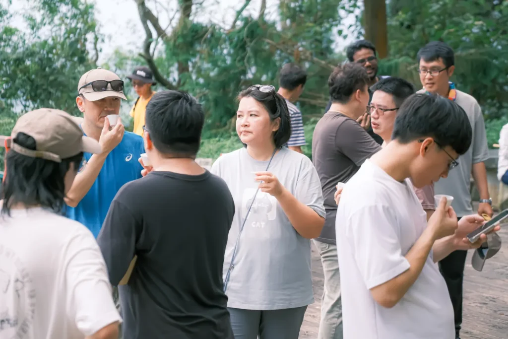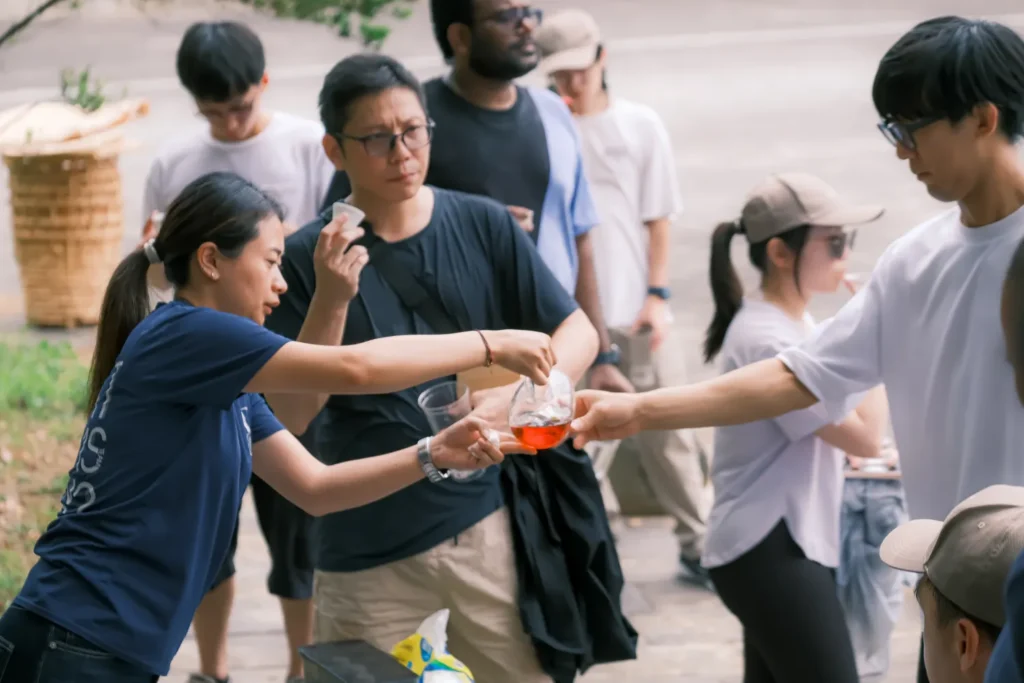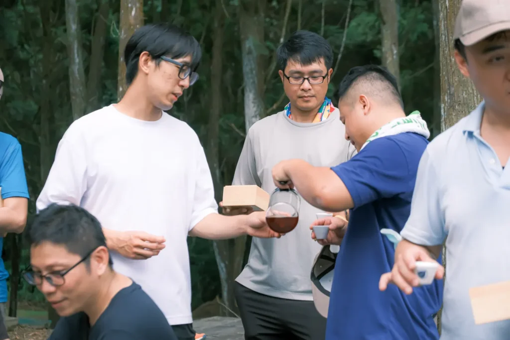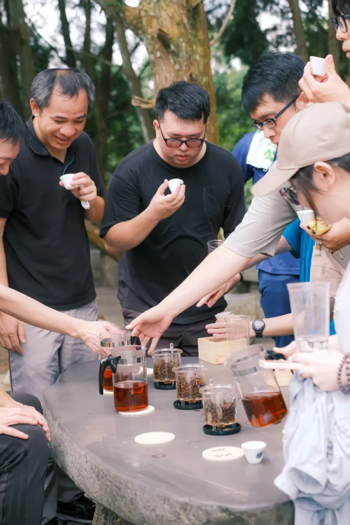登頂後的品茗時光,大家一邊品味在地茶香,一邊交流今日的心得。